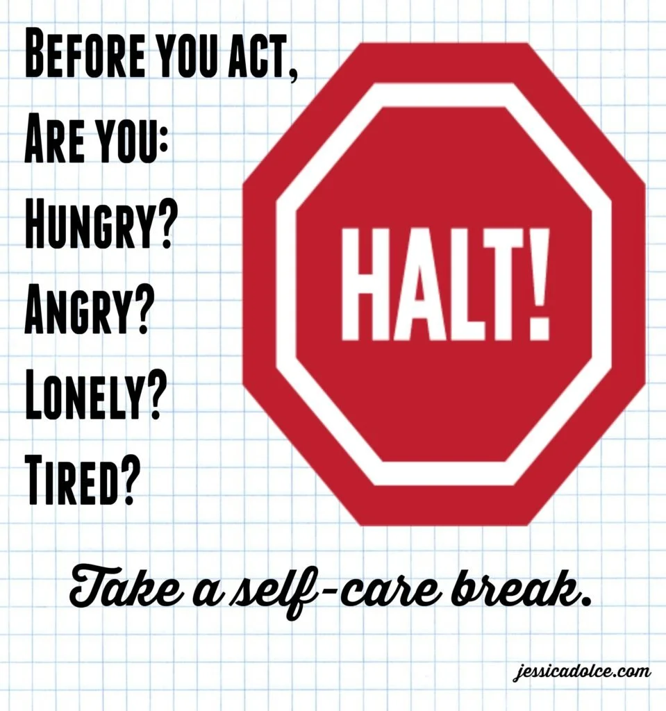 HALT is an acronym that stands for Hungry, Angry, Lonely, Tired. It is a self-diagnostic tool that originated within the drug and alcohol recovery communities. By focusing on these four basic areas, the HALT method acknowledges that "a large part of what triggers negative emotions and reactivity has to do with simple aspects of self-care and self-awareness that can be corrected rather quickly, or at least prepared and accounted for." Think about it. What happens when you're hungry, angry, lonely, or tired?