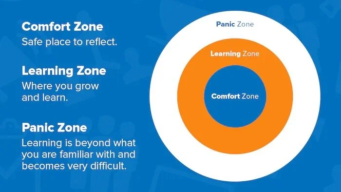 The learning zone model shows how, in order to successfully learn, we must step outside of our comfort zone without entering the panic zone. The panic zone is where we become overwhelmed and unable to cope with the situation at hand. The comfort zone is where we feel safe and secure, but we are not challenged to grow or learn. The learning zone is where we are challenged to grow and learn, but we are not overwhelmed or unable to cope.
